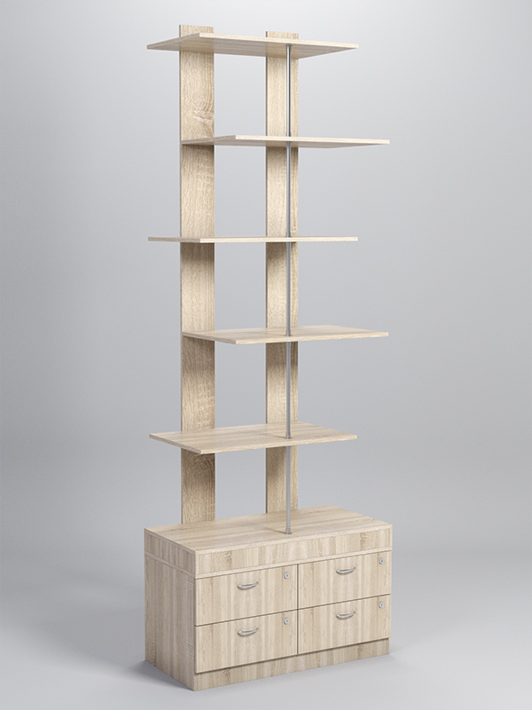 Данный стеллаж содержит пять полок и тумбу с четырьмя выдвижными ящиками. Заднюю стенку имитируют две вертикальные планки. Полки нанизаны на металлический стержень, соединяющий крышу с основанием. Каркас выполнен из ЛДСП. Имеется семь стандартных расцветок. Другие цвета подбираются в палитре на заказ.