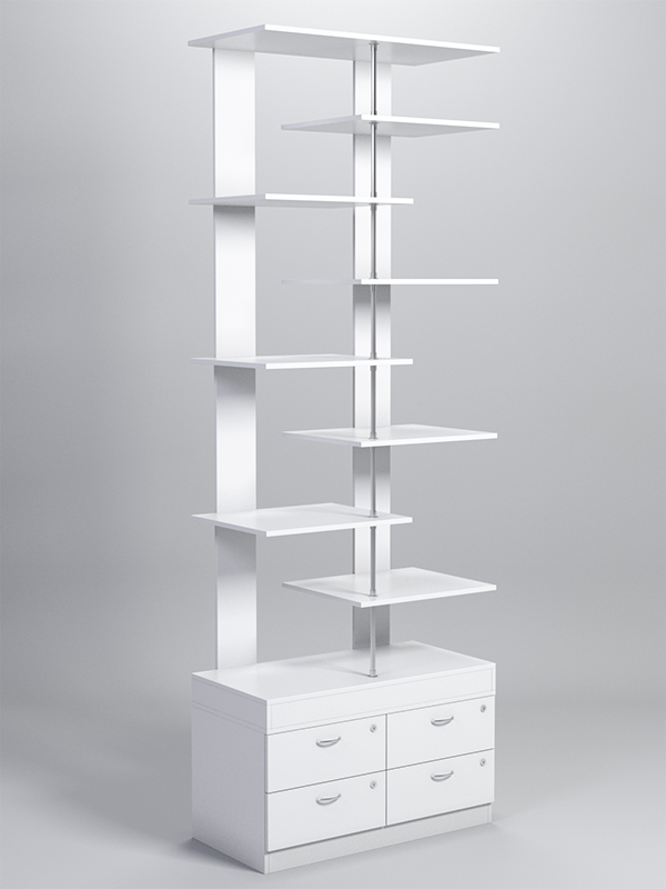 Данный стеллаж содержит восемь полок и тумбу с четырьмя выдвижными ящиками. Заднюю стенку имитируют две вертикальные планки. Полки нанизаны на металлический стержень, соединяющий крышу с основанием, и поочередно крепятся к задним планкам. Каркас выполнен из ЛДСП. Имеется семь стандартных расцветок. Другие цвета подбираются в палитре на заказ.
