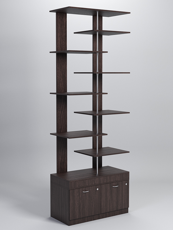 Данный стеллаж содержит восемь полок и тумбу с двумя выдвижными ящиками. Заднюю стенку имитируют две вертикальные планки. Полки нанизаны на металлический стержень, соединяющий крышу с основанием, и поочередно крепятся к задним планкам. Каркас выполнен из ЛДСП. Имеется семь стандартных расцветок. Другие цвета подбираются в палитре на заказ.