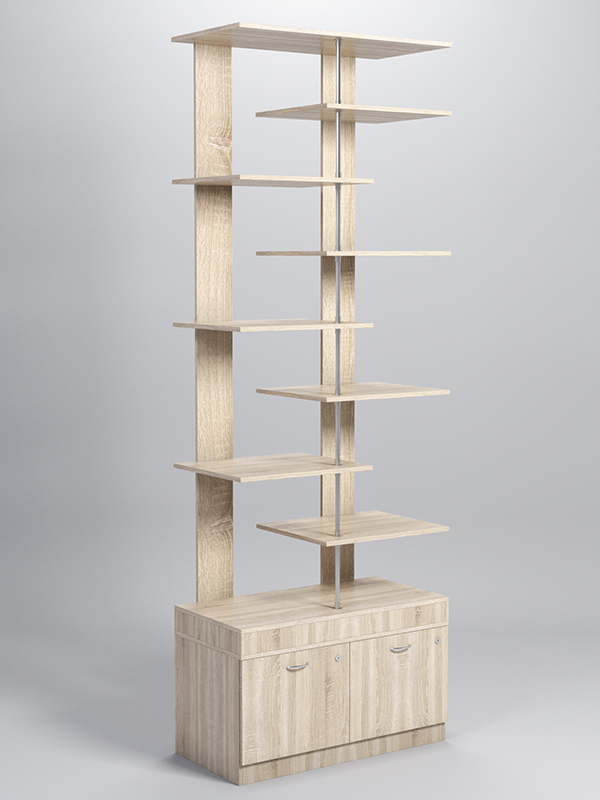 Данный стеллаж содержит восемь полок и тумбу с двумя выдвижными ящиками. Заднюю стенку имитируют две вертикальные планки. Полки нанизаны на металлический стержень, соединяющий крышу с основанием, и поочередно крепятся к задним планкам. Каркас выполнен из ЛДСП. Имеется семь стандартных расцветок. Другие цвета подбираются в палитре на заказ.