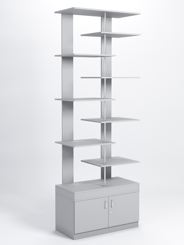 Данный стеллаж содержит восемь полок и тумбу с распашными дверками. Заднюю стенку имитируют две вертикальные планки. Полки нанизаны на металлический стержень, соединяющий крышу с основанием, и поочередно крепятся к задним планкам. Каркас выполнен из ЛДСП. Имеется семь стандартных расцветок. Другие цвета подбираются в палитре на заказ.