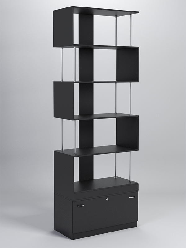 Данный стеллаж содержит пять полок и тумбу с выдвижным ящиком. Заднюю стенку имитирует вертикальная планка. Боковые стенки образованы металлическими стержнями и планками из ДСП, посредством которых полки поочередно соединяются между собой. Каркас выполнен из ЛДСП. Имеется семь стандартных расцветок. Другие цвета подбираются в палитре на заказ.