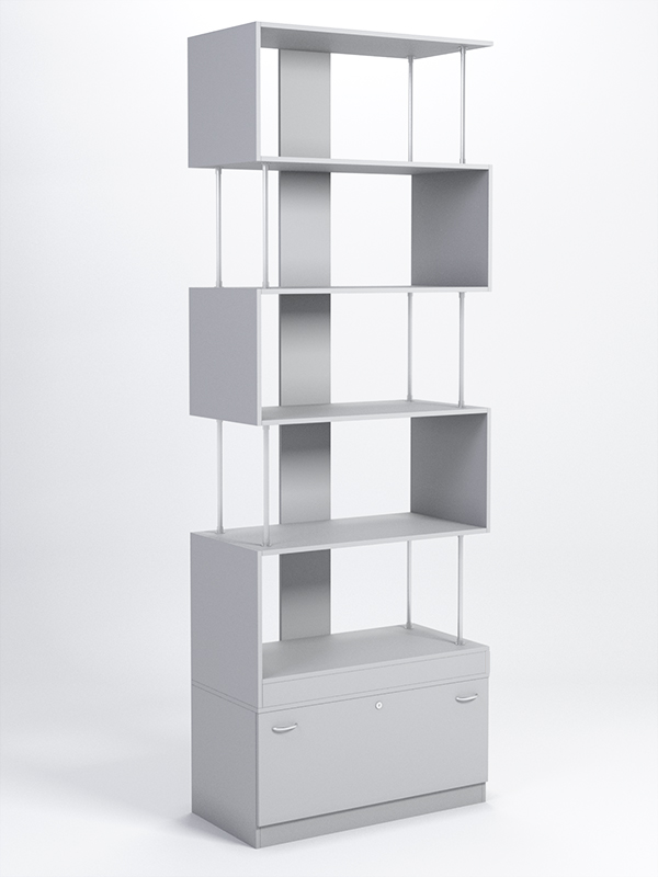 Данный стеллаж содержит пять полок и тумбу с выдвижным ящиком. Заднюю стенку имитирует вертикальная планка. Боковые стенки образованы металлическими стержнями и планками из ДСП, посредством которых полки поочередно соединяются между собой. Каркас выполнен из ЛДСП. Имеется семь стандартных расцветок. Другие цвета подбираются в палитре на заказ.