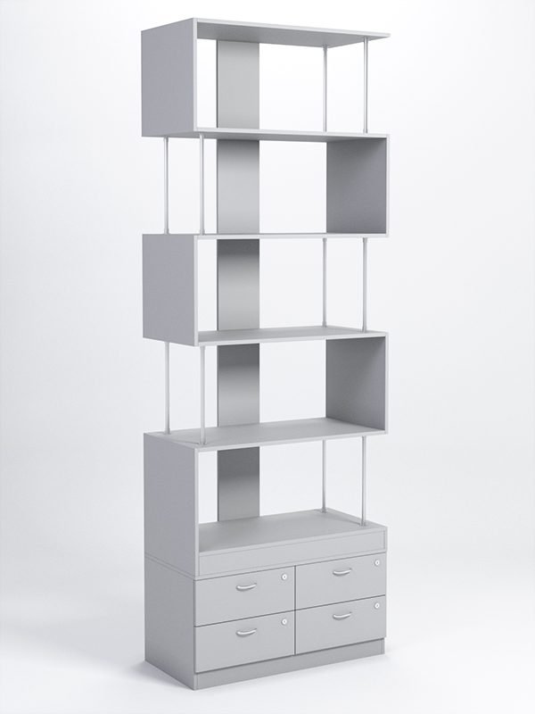 Данный стеллаж содержит пять полок и тумбу с четырьмя выдвижными ящиками. Заднюю стенку имитирует вертикальная планка. Боковые стенки образованы металлическими стержнями и планками из ДСП, посредством которых полки поочередно соединяются между собой. Каркас выполнен из ЛДСП. Имеется семь стандартных расцветок. Другие цвета подбираются в палитре на заказ.
