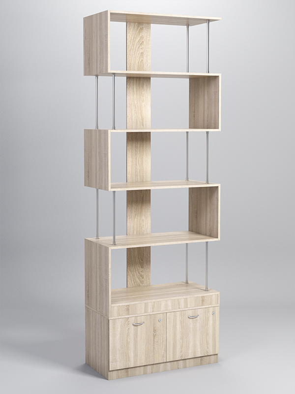 Данный стеллаж содержит пять полок и тумбу с двумя выдвижными ящиками. Заднюю стенку имитирует вертикальная планка. Боковые стенки образованы металлическими стержнями и планками из ДСП, посредством которых полки поочередно соединяются между собой. Каркас выполнен из ЛДСП. Имеется семь стандартных расцветок. Другие цвета подбираются в палитре на заказ.
