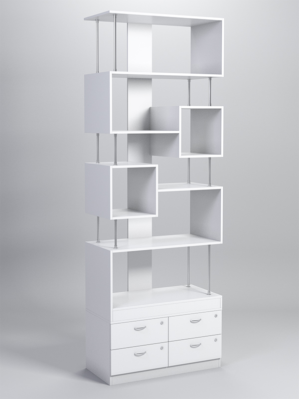 Конструкция представляет собой комбинацию полок и кубов, соединяющихся металлическими стержнями. В основании располагается тумба с четырьмя выдвижными ящиками. Ящики закрываются на ключ.