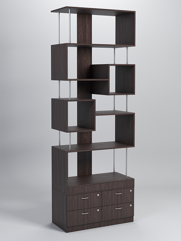 Конструкция представляет собой комбинацию полок и кубов, соединяющихся металлическими стержнями. В основании располагается тумба с четырьмя выдвижными ящиками. Ящики закрываются на ключ.
