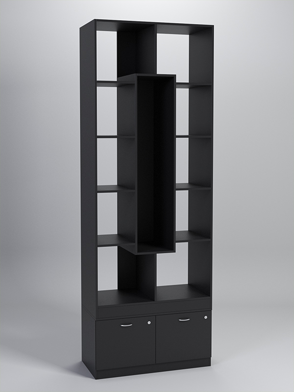 Данный стеллаж содержит восемь полок и тумбу с двумя выдвижными ящиками. Заднюю стенку имитирует вертикальная планка. С помощью дополнительных планок и полок в центре образовано отделение на четыре ячейки. Каркас выполнен из ЛДСП. Имеется семь стандартных расцветок. Другие цвета подбираются в палитре на заказ.