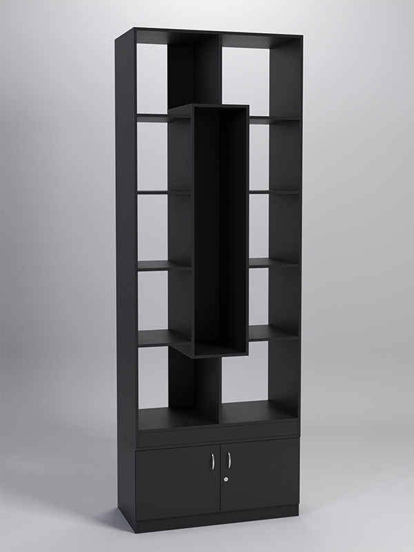 Данный стеллаж содержит восемь полок и тумбу с распашными дверками. Заднюю стенку имитирует вертикальная планка. С помощью дополнительных планок и полок в центре образовано отделение на четыре ячейки. Каркас выполнен из ЛДСП. Имеется семь стандартных расцветок. Другие цвета подбираются в палитре на заказ.