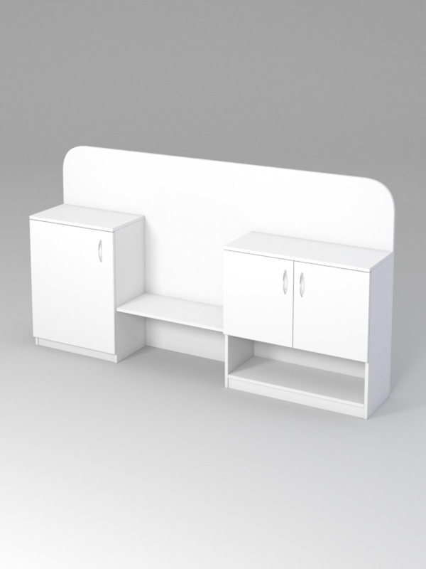 Пристенная конструкция состоит из трех тумб. Левая тумба оборудована распашной дверью. Центральная тумба полностью открытая. Правая тумба представляет собой шкаф с распашными дверями, под которым находится открытое отделение.