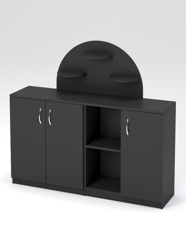 Данная модель представляет собой комбинацию из двух тумб, соединенных задней панелью. На панели расположены три полки. Каркас выполнен из ЛДСП ярких цветов. Габариты модуля соответствуют детскому росту.