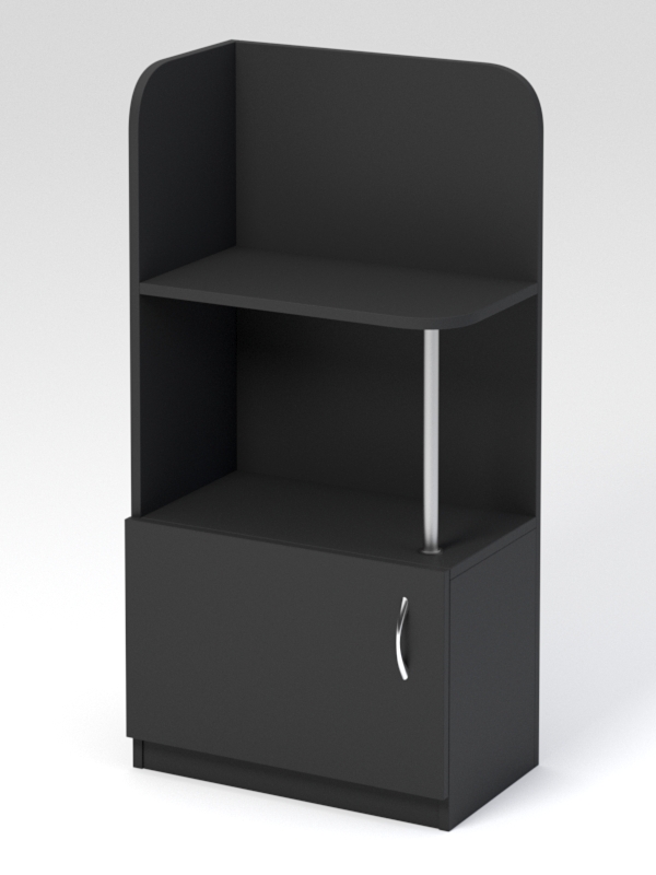 Стеллаж будет уместен, как в детском саду, так и в домашней детской. Данную модель можно расположить вдоль стены или в углу помещения. Корпус стеллажа состоит из двух стенок, образующих угловую конструкцию. В нижней части располагается накопитель с распашной дверью, в верхней — полка. Полка и накопитель соединяются металлическим стержнем.