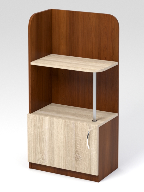 Стеллаж будет уместен, как в детском саду, так и в домашней детской. Данную модель можно расположить вдоль стены или в углу помещения. Корпус стеллажа состоит из двух стенок, образующих угловую конструкцию. В нижней части располагается накопитель с распашной дверью, в верхней — полка. Полка и накопитель соединяются металлическим стержнем.