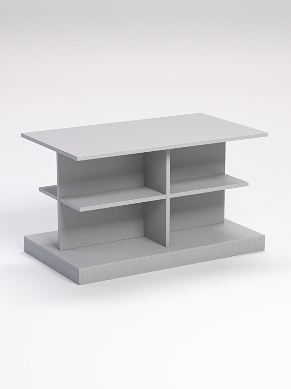 Модель состоит из столешницы и подиума, между которыми располагается полка. Вертикальные панели разбивают внутреннее пространство стола на восемь секций.