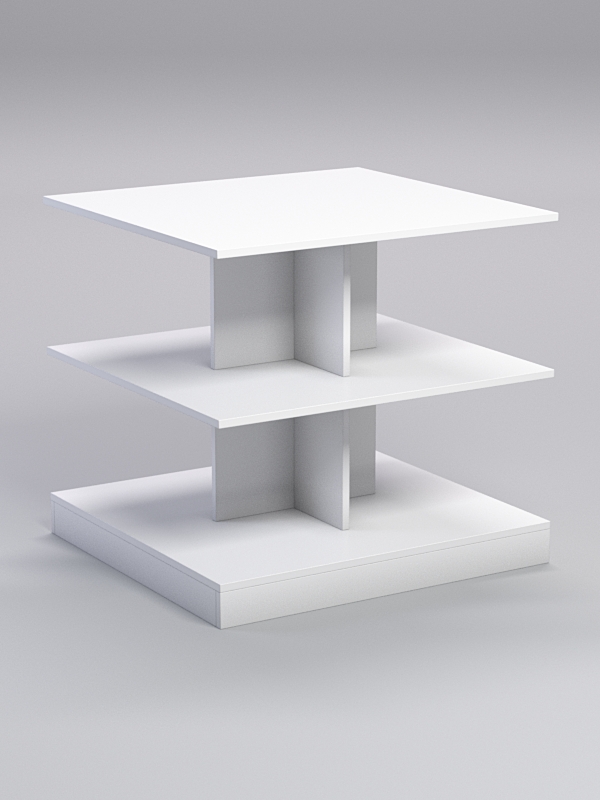 Модель состоит из столешницы, полки и подиума. Вертикальная опора образована из соединенных крест-накрест панелей.