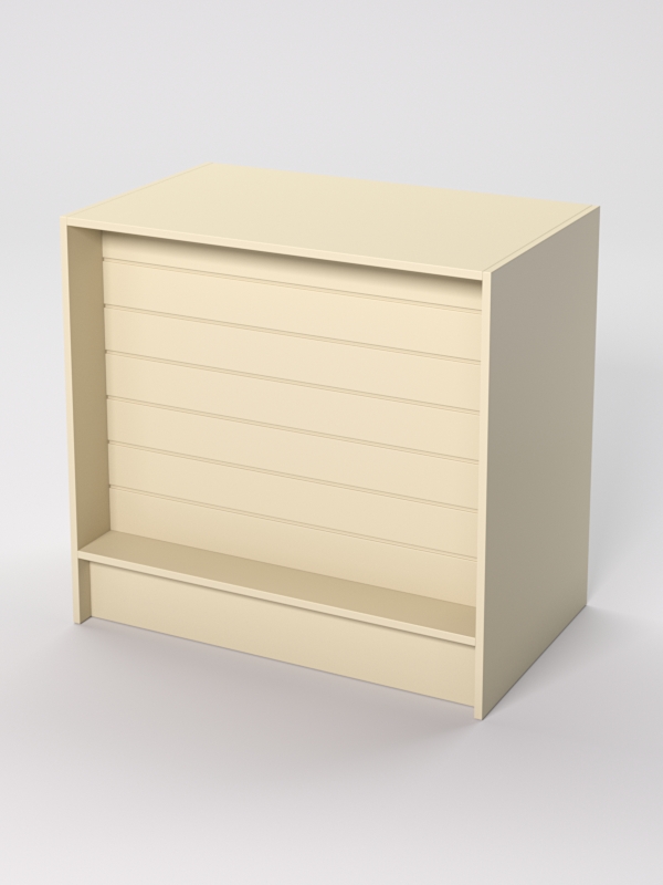 Прилавок с обратной стороны полностью открытый, без полок. В фасадной части размещена экономпанель в комплекте со вставками.