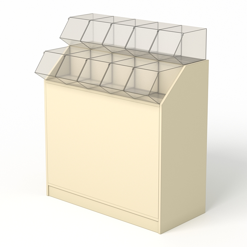 Прилавки с диспенсерами для конфет, печенья, орехов наиболее распространены в гипермаркетах и палатках-островках торговых центров. Система позволяет легко взять желаемый товар. Закрытая конструкция обеспечивает сохранность товара от пыли, влажности и других неблагоприятных воздействий.