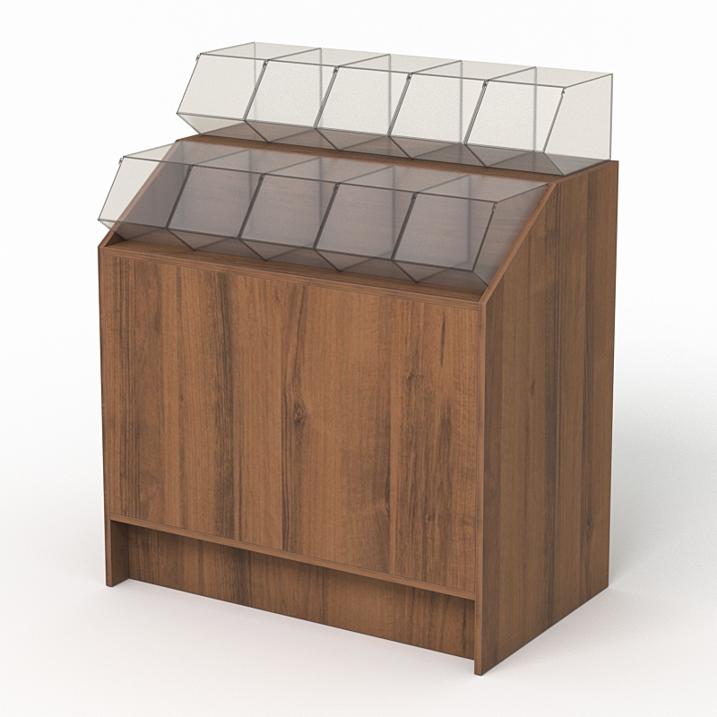 Прилавки с диспенсерами для конфет, печенья, орехов чаще всего размещаются в супермаркетах и торговых центрах. Откидывающаяся передняя стенка диспесера обеспечивает удобный доступ к продукции, а также защищает ее от пыли и внешних воздействий.