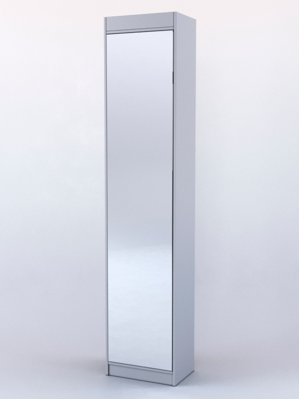 Конструкция выполнена в виде шкафа-пенала с распашной дверью. Лицевая сторона двери представляет собой зеркало. Внутри находится пять полок.