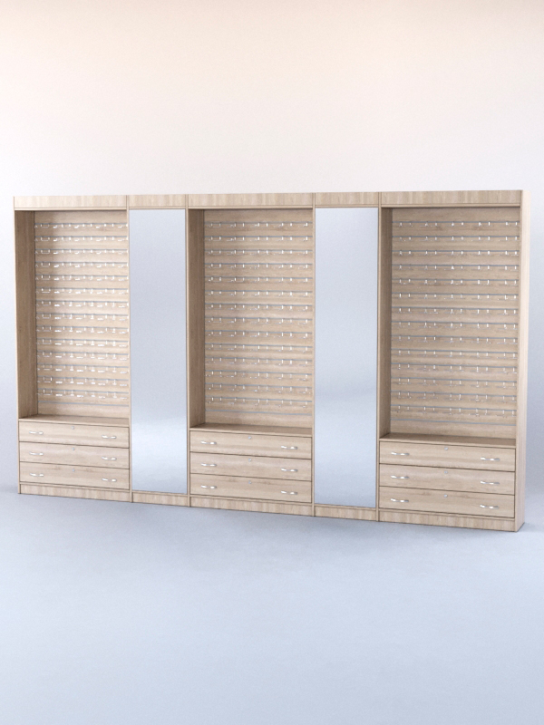 Данная модель состоит из трех открытых витрин, между которыми располагаются два зеркала. Таким образом, можно не только оценить внешний вид очков, но и примерить их, не отходя от витрины. Это обеспечивает лучшую сохранность товара, так как покупатель все время будет находиться в поле зрения продавца.