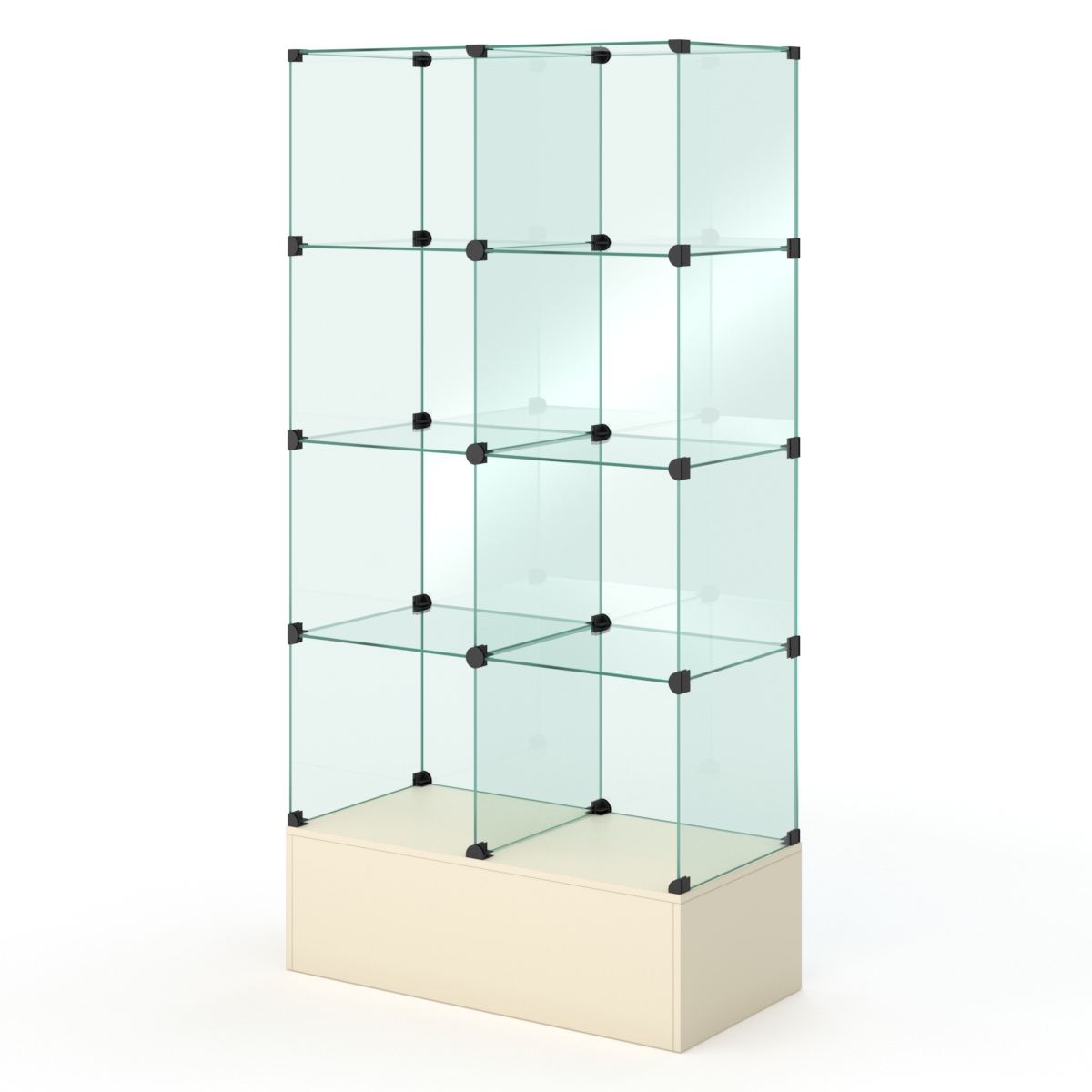 Витрины серии «КУБ» представляют собой сборные стеклянные конструкции. Каждая секция витрин фиксируется специальными крепежами. Вы можете самостоятельно уменьшать или увеличивать количество секций. В основании витрин — накопитель или подиум из ЛДСП 16мм.