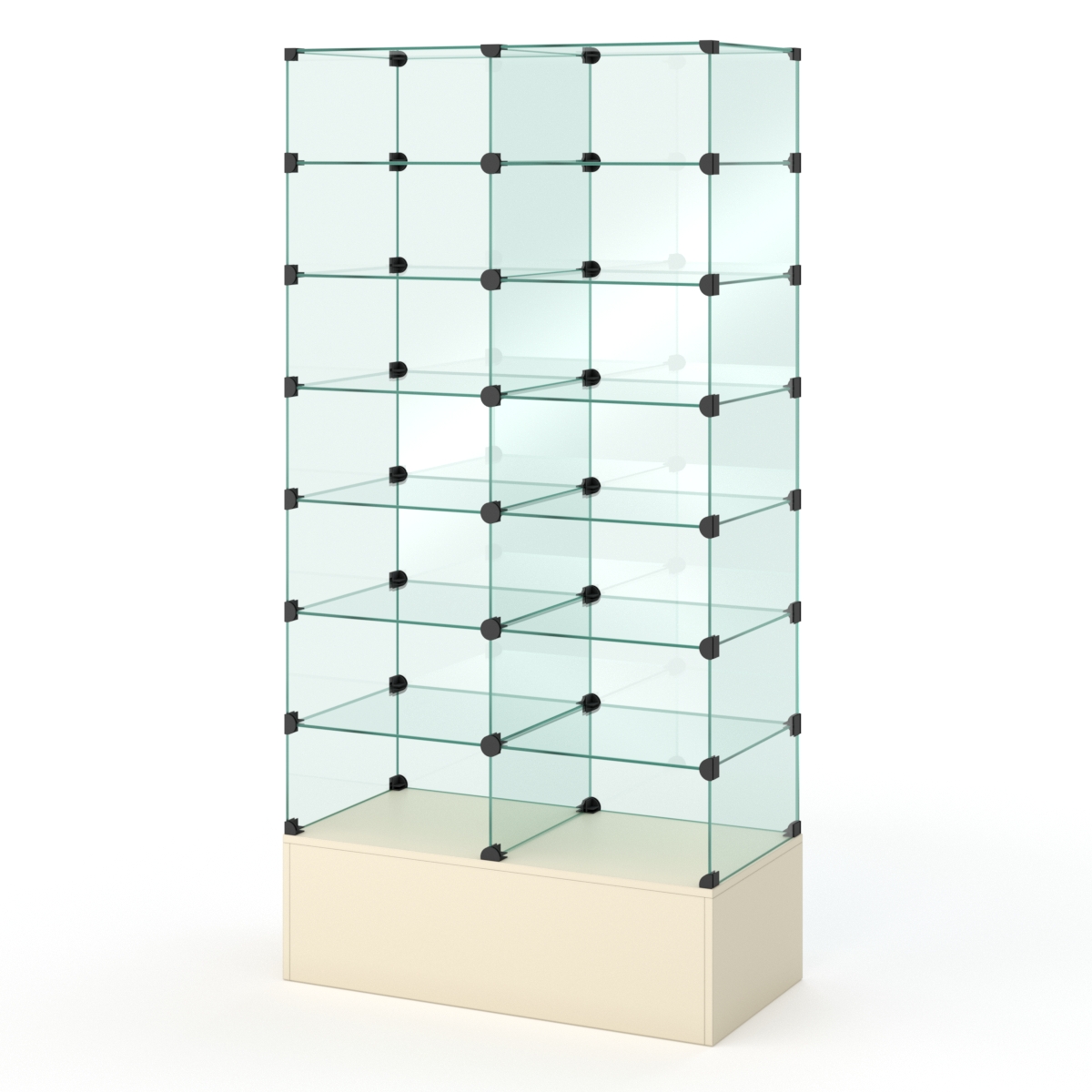 Витрины серии «КУБ» представляют собой сборные стеклянные конструкции. Каждая секция витрин фиксируется специальными крепежами. Вы можете самостоятельно уменьшать или увеличивать количество секций. В основании витрин — накопитель или подиум из ЛДСП 16мм.