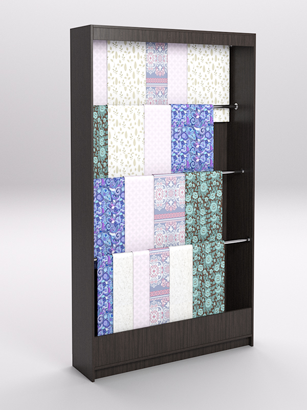 Лучшее решение для продавца — использовать специальные стеллажи. Конструкция стеллажа позволяет расположить ткань в развешенном состоянии, избавляет ее от смятия, обеспечивает легкий доступ для тактильного контакта.