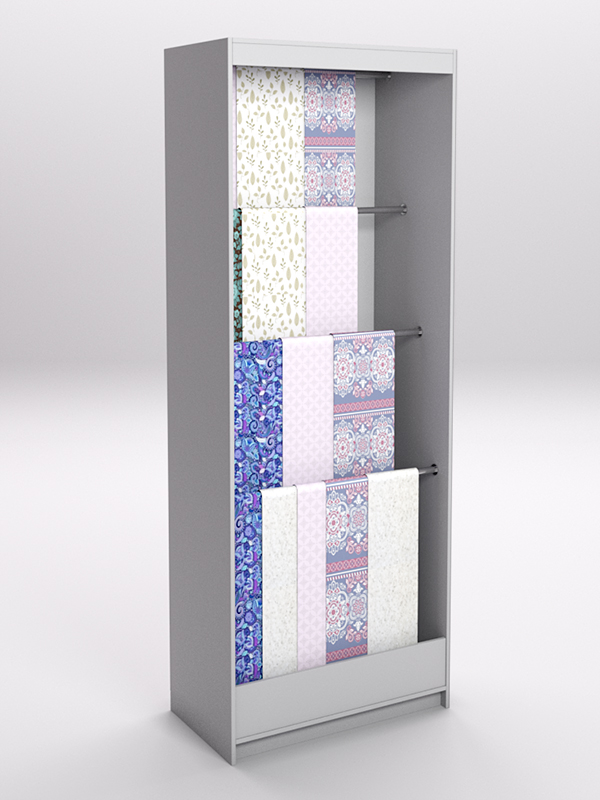 Лучшее решение для продавца — использовать специальные стеллажи. Конструкция стеллажа позволяет расположить ткань в развешенном состоянии, избавляет ее от смятия, обеспечивает легкий доступ для тактильного контакта.