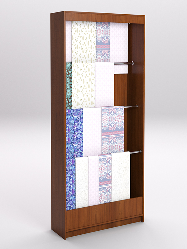 Лучшее решение для продавца — использовать специальные стеллажи. Конструкция стеллажа позволяет расположить ткань в развешенном состоянии, избавляет ее от смятия, обеспечивает легкий доступ для тактильного контакта.