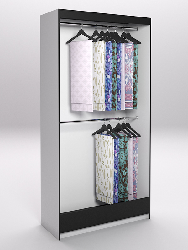 Конструкция представляет собой открытый шкаф с расположенными в два яруса штангами для плечиков.