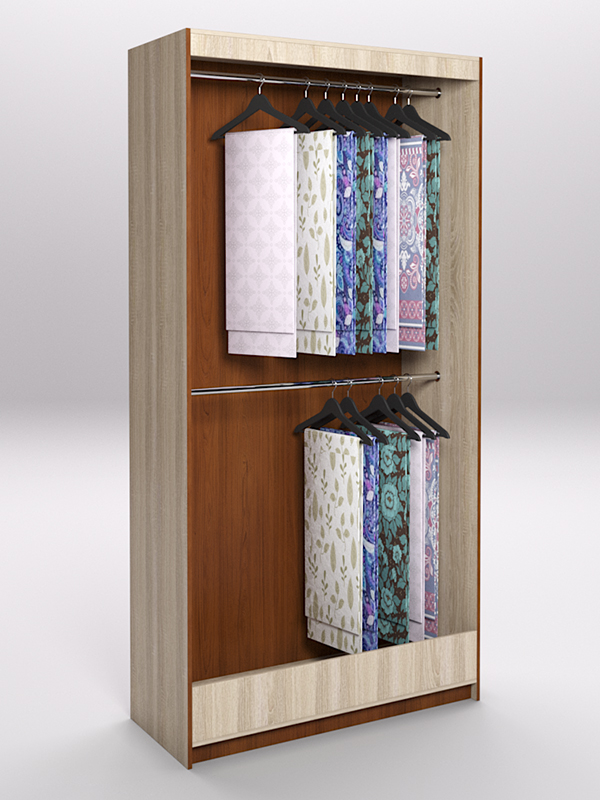 Конструкция представляет собой открытый шкаф с расположенными в два яруса штангами для плечиков.