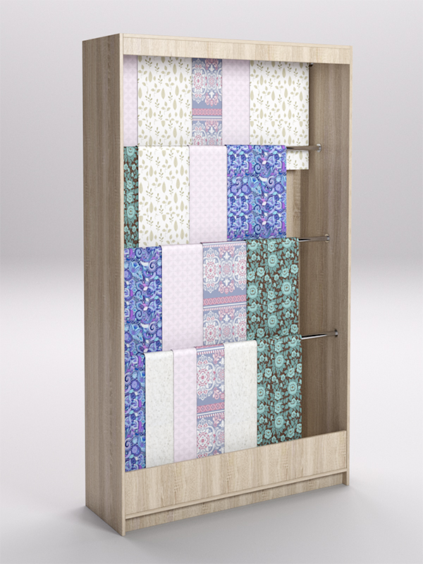 Лучшее решение для продавца — использовать специальные стеллажи. Конструкция стеллажа позволяет расположить ткань в развешенном состоянии, избавляет ее от смятия, обеспечивает легкий доступ для тактильного контакта.