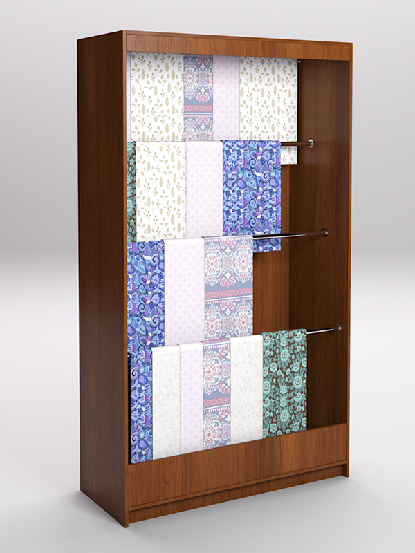 Лучшее решение для продавца — использовать специальные стеллажи. Конструкция стеллажа позволяет расположить ткань в развешенном состоянии, избавляет ее от смятия, обеспечивает легкий доступ для тактильного контакта.