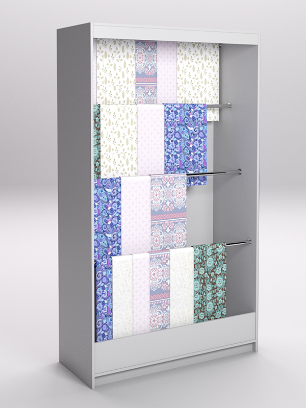 Лучшее решение для продавца — использовать специальные стеллажи. Конструкция стеллажа позволяет расположить ткань в развешенном состоянии, избавляет ее от смятия, обеспечивает легкий доступ для тактильного контакта.