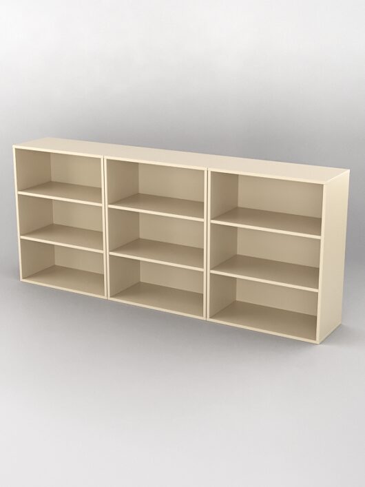 Комплект состоит из трех одинаковых стеллажей с закрытой задней стенкой. В каждом стеллаже две полки. Нагрузка на полки 10-12кг при равномерном распределении предметов.