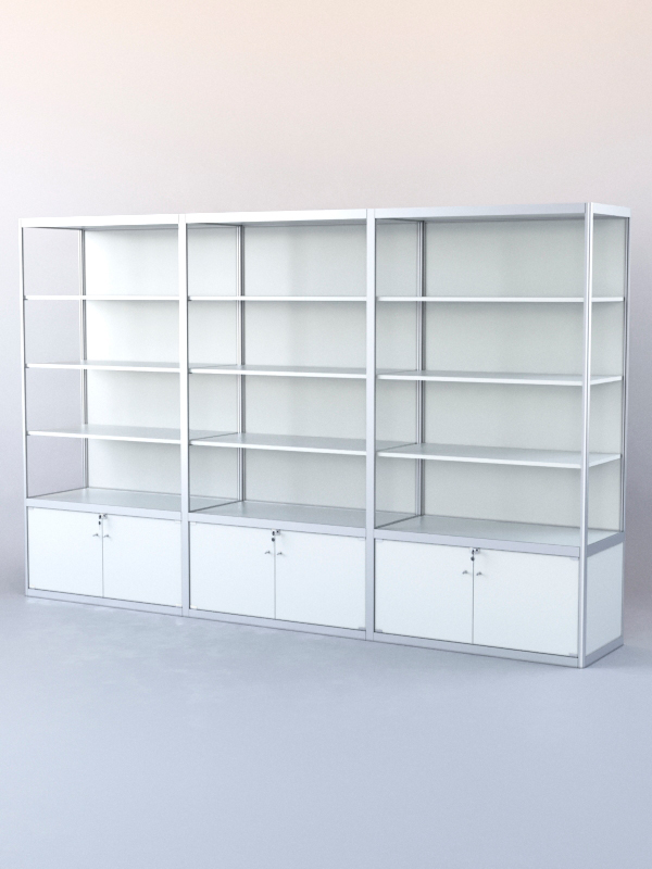 Конструкция состоит из трех секций. Каждая секция содержит три полки, накопитель. Боковые стенки в секциях отсутствуют. Накопители оборудованы распашными дверками с замком.