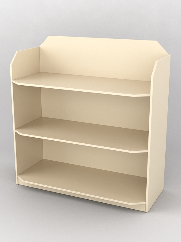 Стеллаж имеет три полки. Каркас выполнен из ДСП. Цвет материала подбирается в вариантах стандарт и на заказ.