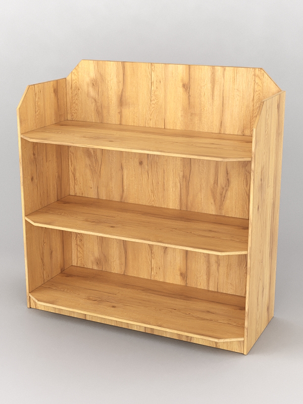 Стеллаж имеет три полки. Каркас выполнен из ДСП. Цвет материала подбирается в вариантах стандарт и на заказ.