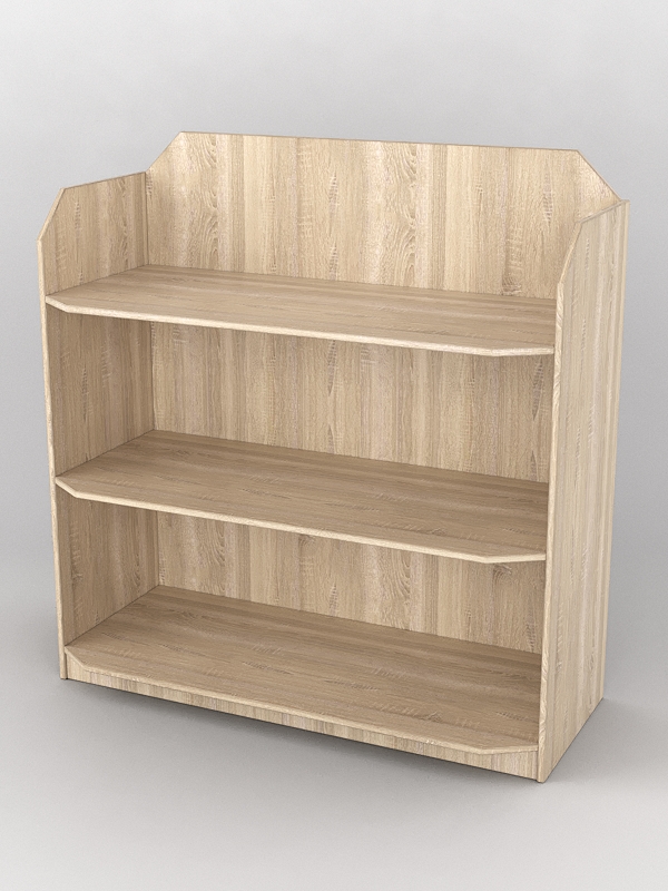 Стеллаж имеет три полки. Каркас выполнен из ДСП. Цвет материала подбирается в вариантах стандарт и на заказ.