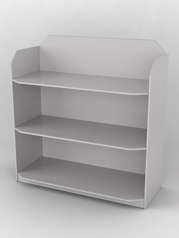 Стеллаж имеет три полки. Каркас выполнен из ДСП. Цвет материала подбирается в вариантах стандарт и на заказ.