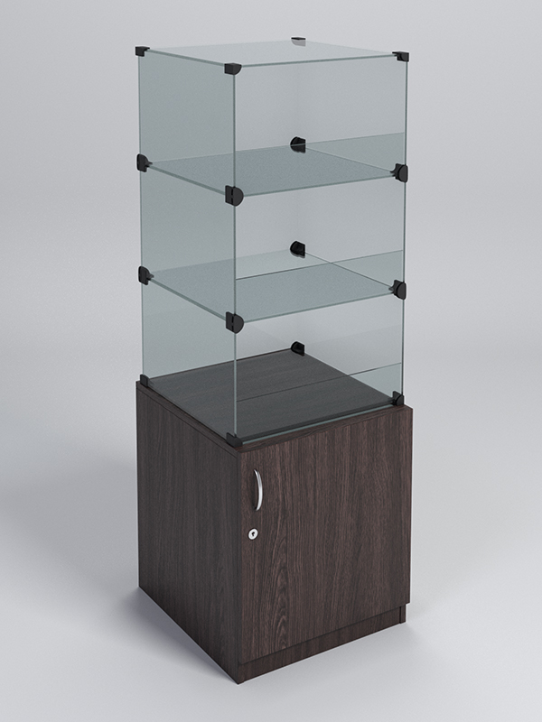 Стойка из три секций для размещения продуктов. Корпус и полки выполнены из стекла, что делает конструкцию воздушной и прозрачной. Передняя часть отделений открыта и оборудована бортиком, предотвращающим выпадение продукции.
