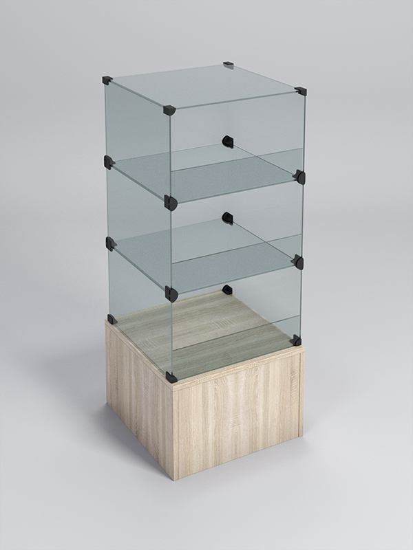 Данная модель состоит из трех стеклянных секций и подиума из ДСП. Секции открыты с внутренней стороны, каждая секция ограничена бортиком.