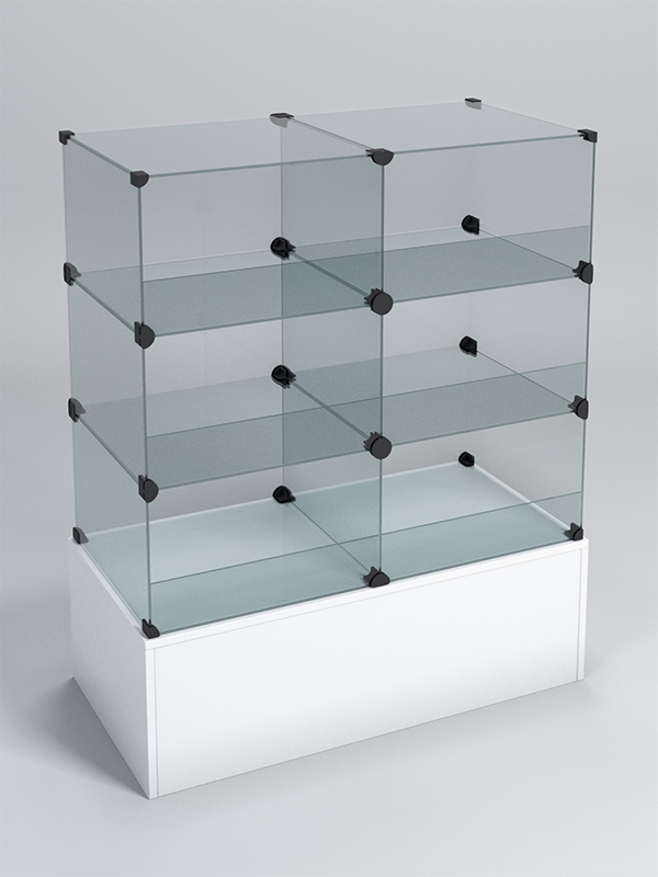 Данная модель состоит из шести стеклянных секций, расположенных по три в столбце, и подиума из ДСП. Секции открыты с внутренней стороны, каждая секция ограничена бортиком.
