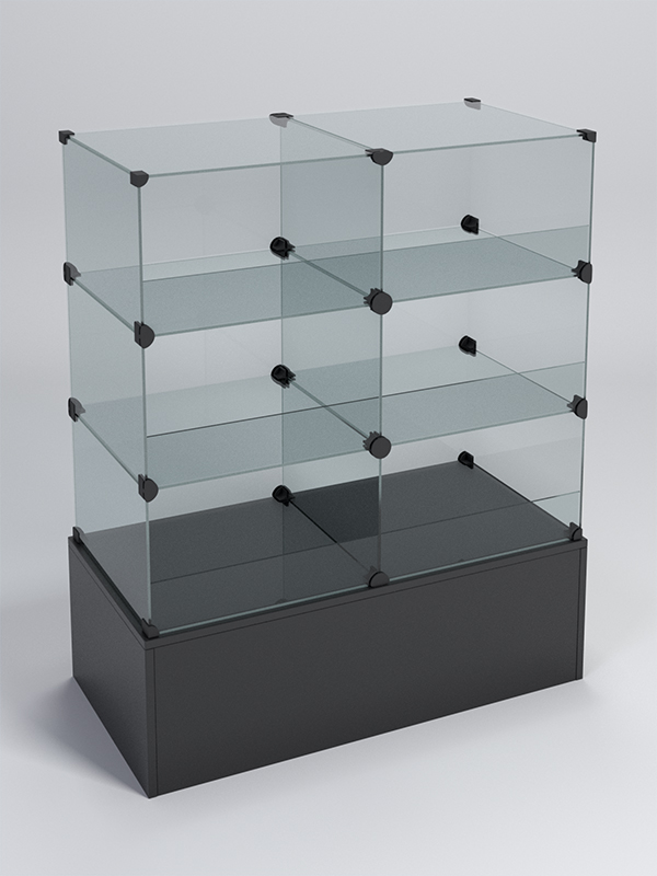 Данная модель состоит из шести стеклянных секций, расположенных по три в столбце, и подиума из ДСП. Секции открыты с внутренней стороны, каждая секция ограничена бортиком.