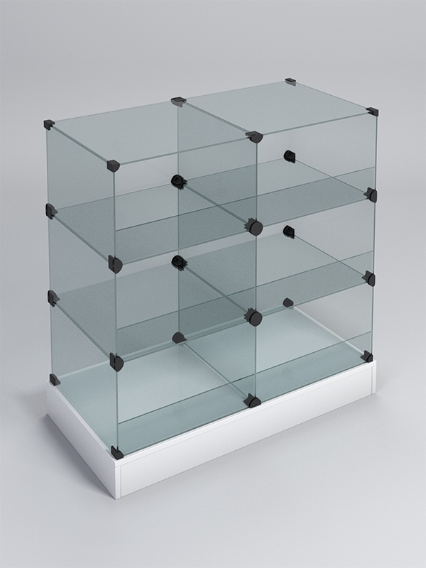 Стойка собирается из двух частей, каждая из которых имеет три секции для размещения продуктов. Корпус и полки выполнены из стекла, что делает конструкцию воздушной и прозрачной. Передняя часть отделений открыта и оборудована бортиком, предотвращающим выпадение продукции.